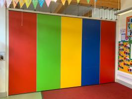 A vibrant community school in Hackney requested a partition featuring blue sky, green grass, yellow sun & red rose. Everything in our world has a colour associated with it. For children in a learning environment, colour can have an effect on mood, emotion and productivity, making it an important and much-overlooked consideration in school design. Coloured surfaces enliven, enrich, energize and increase student’s brain function, helping eliminate eyestrain, monotony and dullness. Incorporating the colours of the rainbow in the classroom can make children feel enlivened, attentive and happy to be at school.