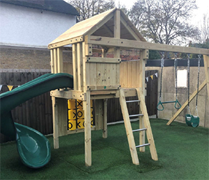 As well as swings we managed to fit in an exciting spiral slide plus a Tic Tac Toe games panel on the Canyon Clubhouse structure. The whole installation is on artificial grass to make it look especially smart and help keep the young users safe.