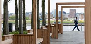 Contor wall-top seating solutions were developed and fixed to the existing brick walls at the Stratford campus; while a number of Fordham five-person seats with thick iroko-timber slats were installed along the new timber pergolas at the Docklands campus along with bespoke Fordham wall-top designs which were created and fixed to the walls adjacent to the riverside. From here, students and staff can enjoy beautiful views of the east end skyline, Thames and London City Airport.