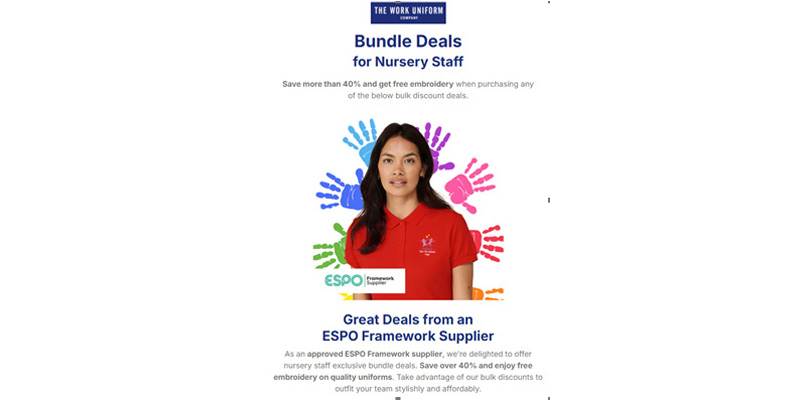 As an approved ESPO Framework supplier, we're delighted to offer nursery staff exclusive bundle deals. Save over 40% and enjoy free embroidery on quality uniforms. Take advantage of our bulk discounts to outfit your team stylishly and affordably.