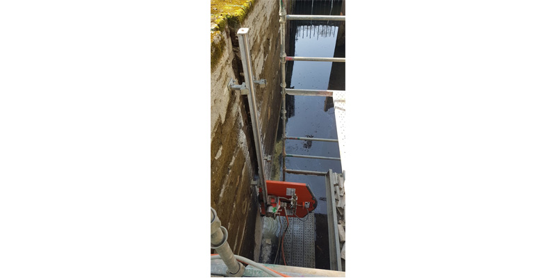 When we arrived the lock had already been drained with only a few feet of water remaining. A scaffold system had been installed to provide access to the lock walls. We first formed 2nr vertical chases approx. 35mm wide x 225mm deep either side of the recess using a track saw bolted to the lock wall. We then formed the bottom of the recess by stitch drilling a line of 107mm diameter holes.