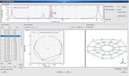• Mode Shape Validation Wizard with Circle Fit Editor: the ideal accompaniment to normal mode tuning. In conjunction with the interactive mode shape animation it is perfectly suited for checking and optimizing each FRF measurement. The modern interactive multi-display implementation makes this traditional technique quick and easy to review and validate data across even high channel counts.