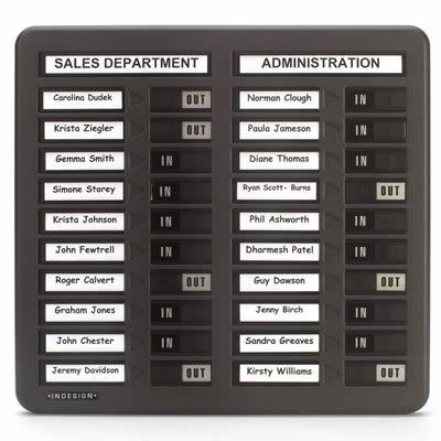 The Staff In/Out Board allows you to insert names cards, photo''s, write notes and track who is working on which day.