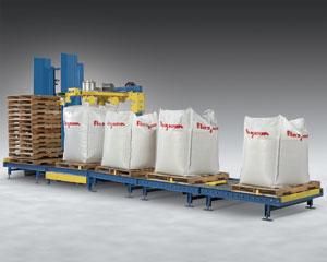The new bag filling equipment can simplify and reduce bag filling times since it automatically dispenses the pallets, fills the bulk bags and then accumulates for removal by forklift.The Flexicon system incorporates a dispenser which holds up to 15 pallets and a powered roller conveyor that removes the bottom-most pallet and positions it directly beneath the cantilevered fill head of the bulk bag filler. At the fill station an operator connects an empty bag to the four actuated bag strap hooks, seals the bag spout using an inflatable collar and presses a bag inflation button to initiate a seven-step automated filling sequence. This calls for delivery of material for either a Flexicon flexible screw or pneumatic conveyor, filling the bag at high rates initially before automatically reducing delivery speed as the target weight is approached.