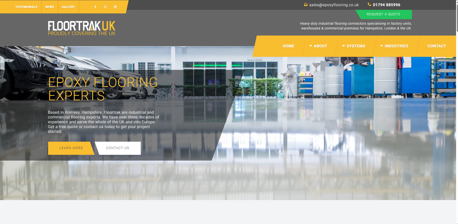 Floortrak are based in Romsey, Hampshire and we’re specialists in industrial flooring solutions such as heavy duty resin, heavy duty cementitious, flow applied epoxy and heavy duty resin bound epoxy screeds. We have over 30 years of experience in the industry, with an impeccable reputation for customer service.