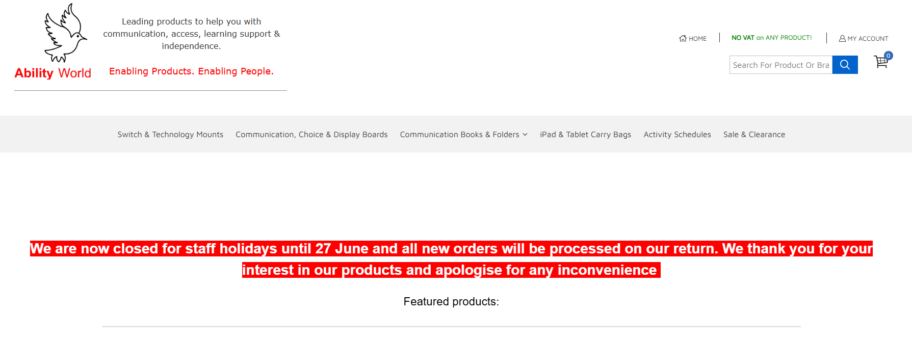 Thank you for visiting Ability World Ltd. We are a leading UK manufacturer and supplier of products that support people with their communication, literacy, learning and independence, including a wide range of communication books, portable switch mounts, iPad carry bags, activity planners and other resources. In addition, our larger portable display boards are used throughout all sectors of retail, commerce and industry, and extensively in the public services sector, particularly in pre-schools, schools, colleges, care homes, libraries and prisons, as well as for private events such as weddings and funerals. If you have any questions, please contact us - we will be more than happy to help! David Weatherburn Managing Director