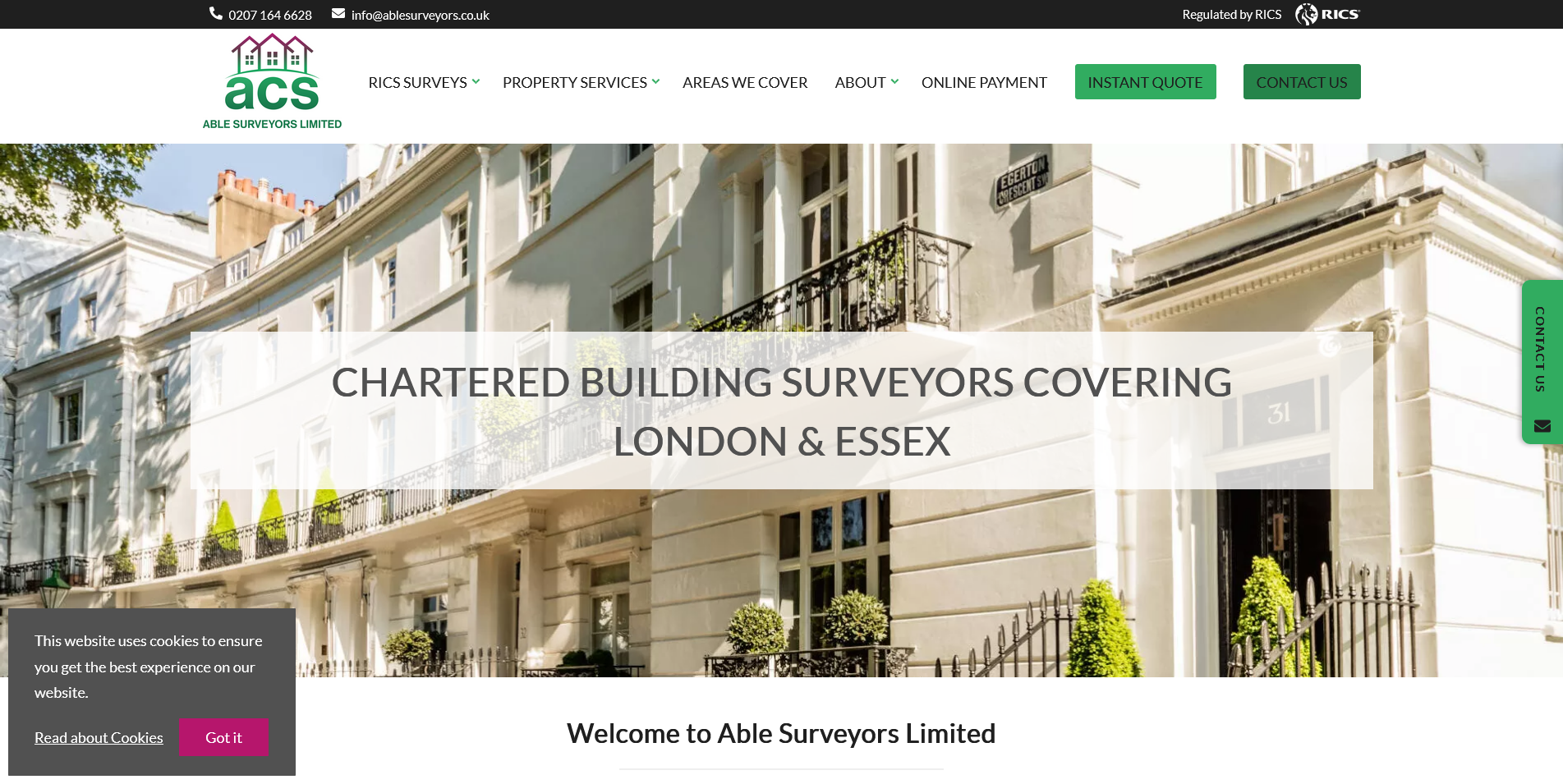 Able Surveyors Ltd are RICS Chartered Surveyors in London, Essex and the Home Counties. Our competent team has a wealth of experience conducting residential property surveys for homebuyers and providing commercial building surveys and property management services. As independent surveyors, our professional advice is honest and impartial. Get in touch to discuss your surveying needs and to get an instant quote.