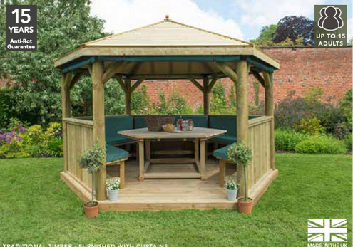 Our gazebos come with excellent quality timber, with a 15 year anti rot and anti infestation guarantee, and are manufactured in the UK.
