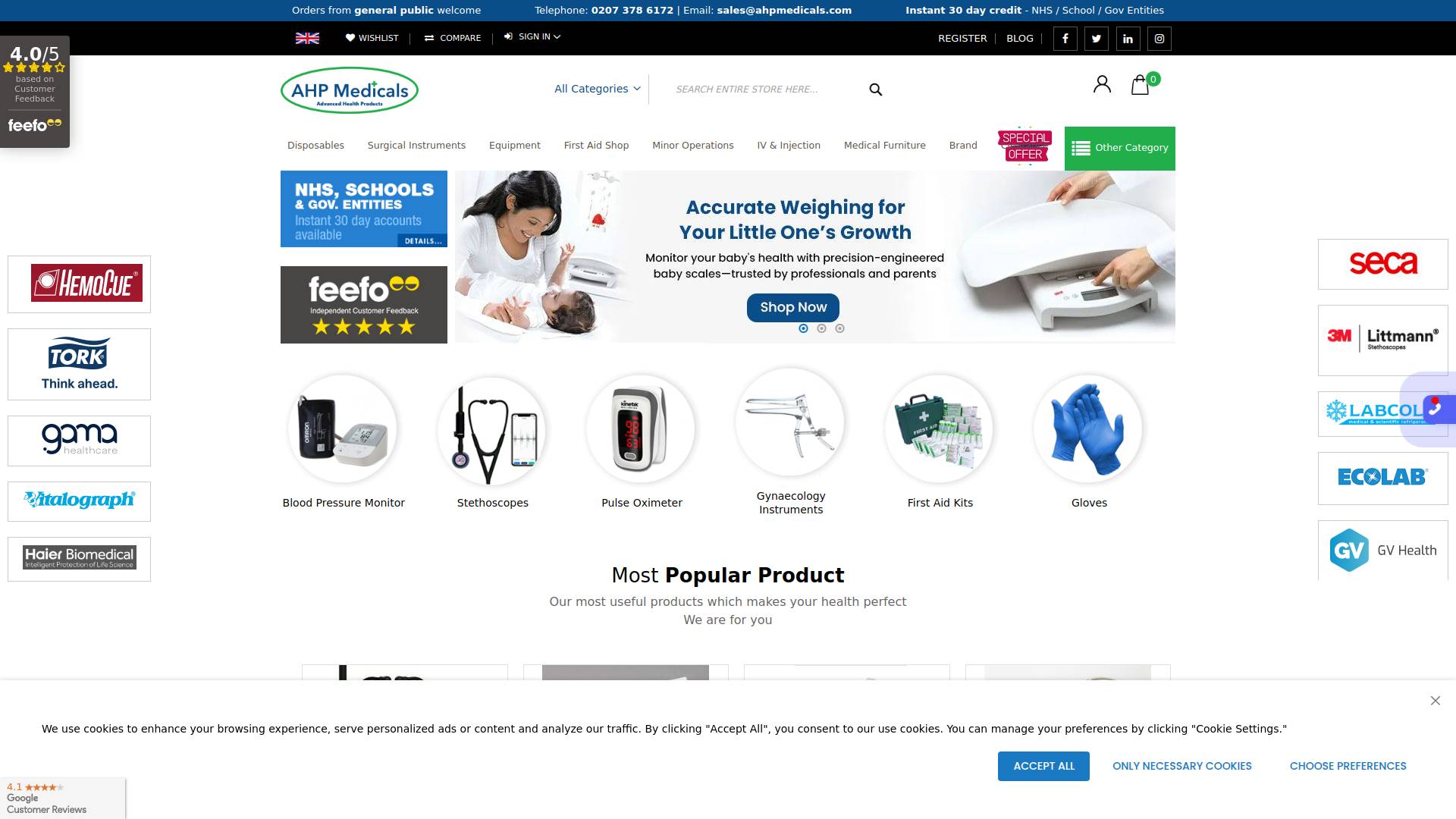 AHP Medicals has one of the largest range of medical equipment and supplies compared to most online medical supply stores in UK. With our low price range, variety and quality medical product, we add vitality to your life. We are your one-stop-shop for medical products and home medical supplies. Our mission is to procure and distribute the highest quality brand name medical equipment and supplies at reasonable prices. From first aid kit online to medical refrigerators, home health care to surgical supplies, you’ll find everything you need within our online medical supply store.