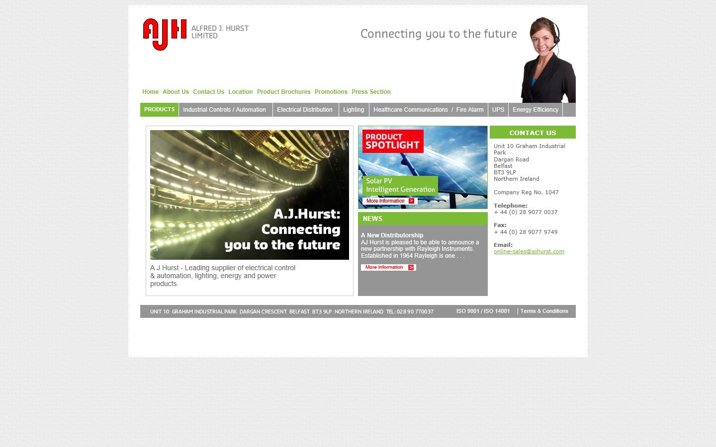 AJ Hurst Ltd are a Belfast based company dealing with industrial controls and automation, electrical distribution, lighting, healthcare communications, wireless communications, energy efficiency, uninterruptable power supplies, bedhead services trunking and so on.