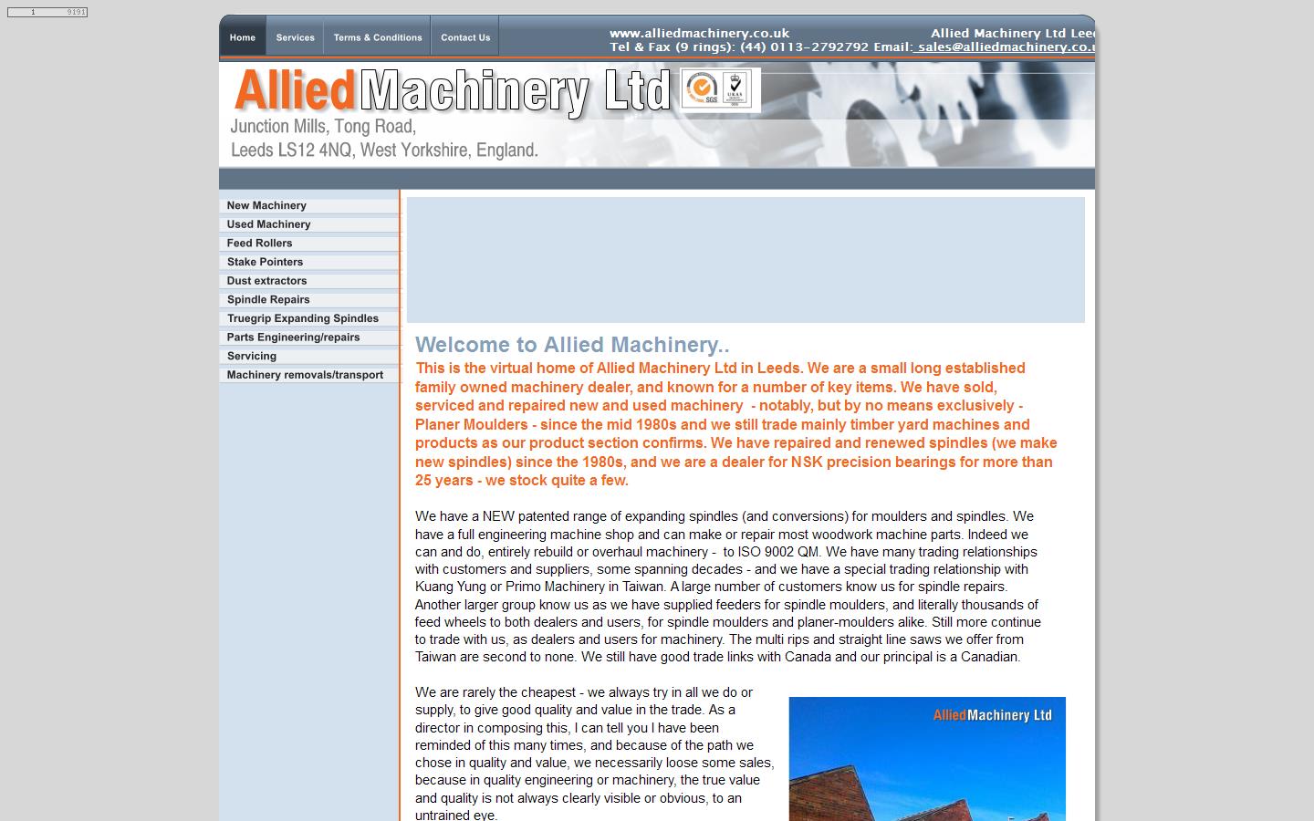 This is the virtual home of Allied Machinery Ltd in Leeds. We are a small long established family owned machinery dealer, and known for a number of key items. We have sold, serviced and repaired new and used machinery - notably, but by no means exclusively - Planer Moulders - since the mid 1980s and we still trade mainly timber yard machines and products as our product section confirms. We have repaired and renewed spindles (we make new spindles) since the 1980s, and we are a dealer for NSK precision bearings for more than 25 years - we stock quite a few