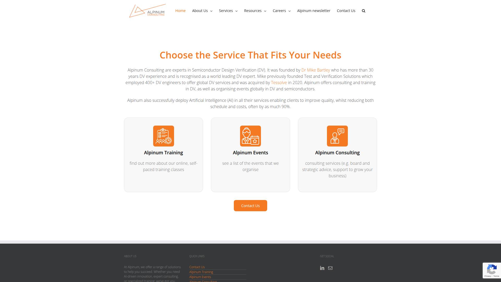 Alpinum Consulting is a UK-based firm specializing in AI-driven innovation, expert consulting, and specialized training to support business growth. Their services include online self-paced training classes, event organization, and strategic advisory support. The company is led by Dr. Mike Bartley, who has over 30 years of experience in software testing and hardware verification.