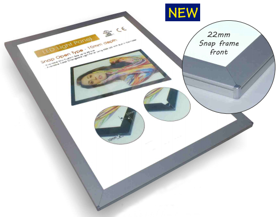 The functional snap frame fronted light boxes with their energy saving illumination make these ultra slim light boxes the perfect display light box. The aluminium section, at only 20mm or 16mm deep with a 25mm wide snap frame, is an ultra slim and attractive light box with neat rounded corner pieces. Simply snap open the front frame change the poster and snap shut - it's simple and convenient.