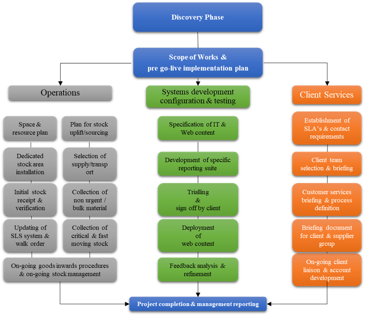 Effective implementation is the key to successful fulfilment. We have many years experience of client implementation/integration programmes and we’re very good at it. All we ask is that you share all the advance information you can, on stock, systems and even your business objectives and imperatives. Then give us the time to plan and test to make sure that when we get to Go Live Date it will all go like a hot knife through butter. We believe passionately that proper prior planning prevents poor performance.