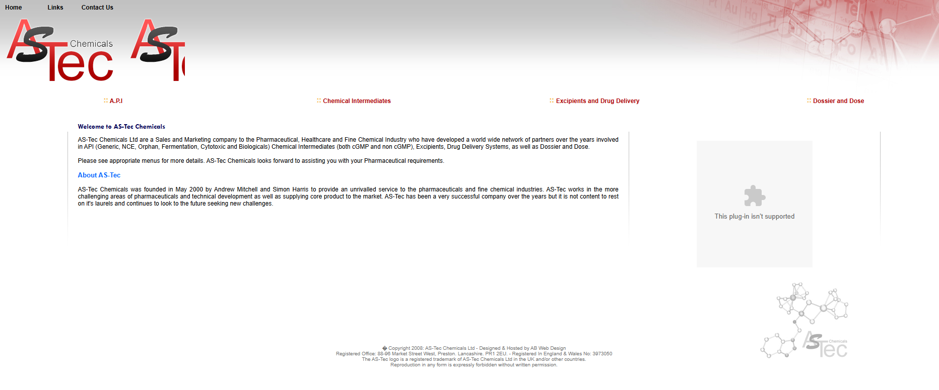AS-Tec Chemicals was founded in May 2000 by Andrew Mitchell and Simon Harris to provide an unrivalled service to the pharmaceuticals and fine chemical industries. AS-Tec works in the more challenging areas of pharmaceuticals and technical development as well as supplying core product to the market. AS-Tec has been a very successful company over the years but it is not content to rest on it's laurels and continues to look to the future seeking new challenges.