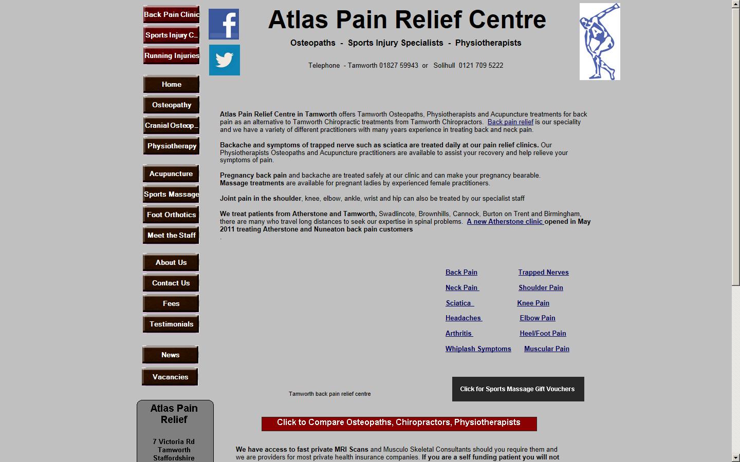 Atlas Pain Relief Centre are specialists in osteopathy and physiotherapy. We deal with sports injuries, back pain and back pain relief, cranial osteopathy, acupuncture, sports massage, foot orthotics and running injuries.