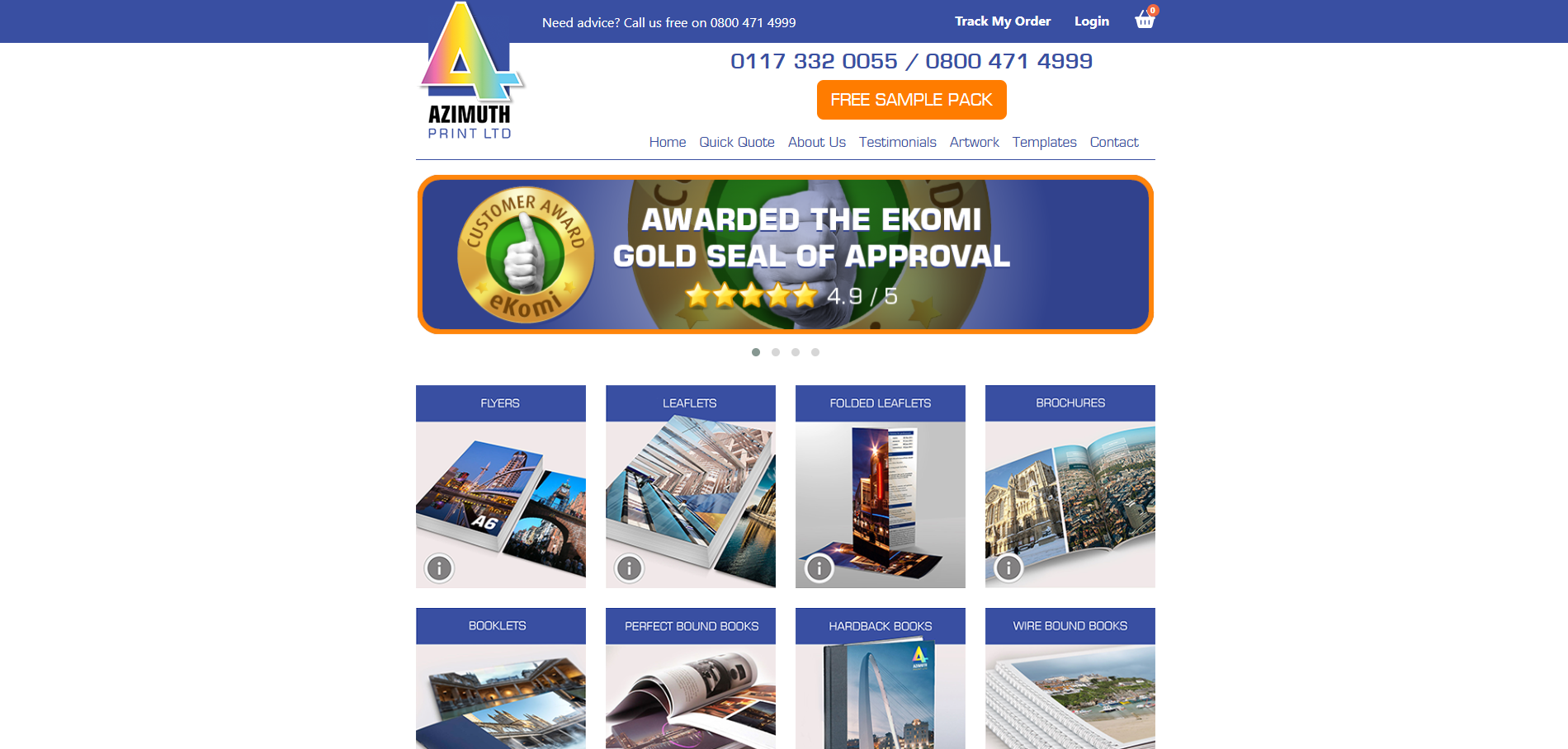 Azimuth Print the premier on-line printer offers a fast, efficient and cost effective printing service. Our products include flyers, leaflets, folded leaflets (single fold, two fold, cross fold, gate fold, map fold, 8PP DL fold, 12PP DL fold) , postcards, folders, books, booklets (soft-self cover, heavy cover, heavy laminated cover), calendars and stationery (business cards, letterheads, printed envelopes, compliment slips).