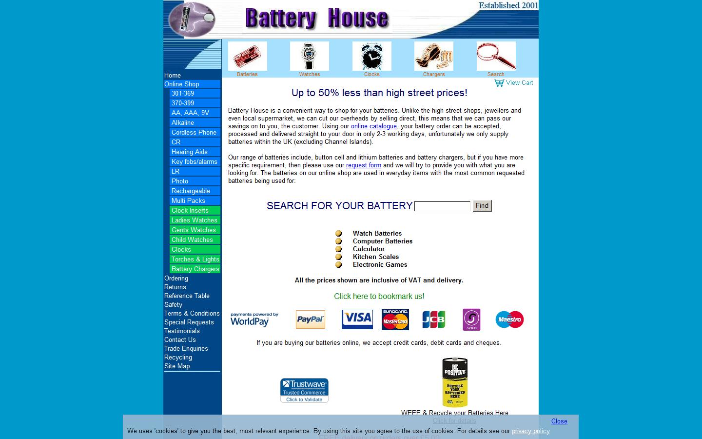 Battery House are major suppliers of various kinds of batteries such as AA and AAA batteries, rechargeable batteries, battery chargers, CR2 batteries, alkaline batteries, hearing aid batteries, watch batteries, 4LR44 and 4LR61 batteries, other CR batteries and much more.
