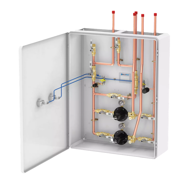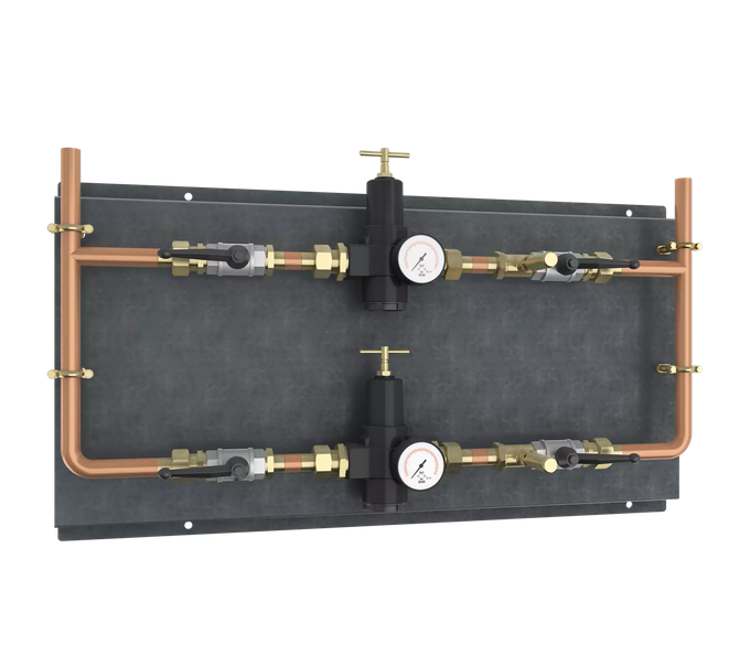 The pressure reducing set is designed for use in medical applications, to reduce the output pressure of the surgical or combined medical air system to the required pipeline pressure. All components are fully duplexed allowing one side to be completely isolated for maintenance purposes, without interrupting the life supporting medical gas supply.