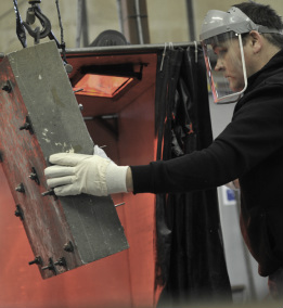 We inject a reactive mixture of resin polyol with an ISO curing agent into a closed mould-tool. The mixture instantly reacts and greatly expands, filling the tool cavity to a density of around 600 kg/m3 and at the same time forming a hard, solid resin skin all round.