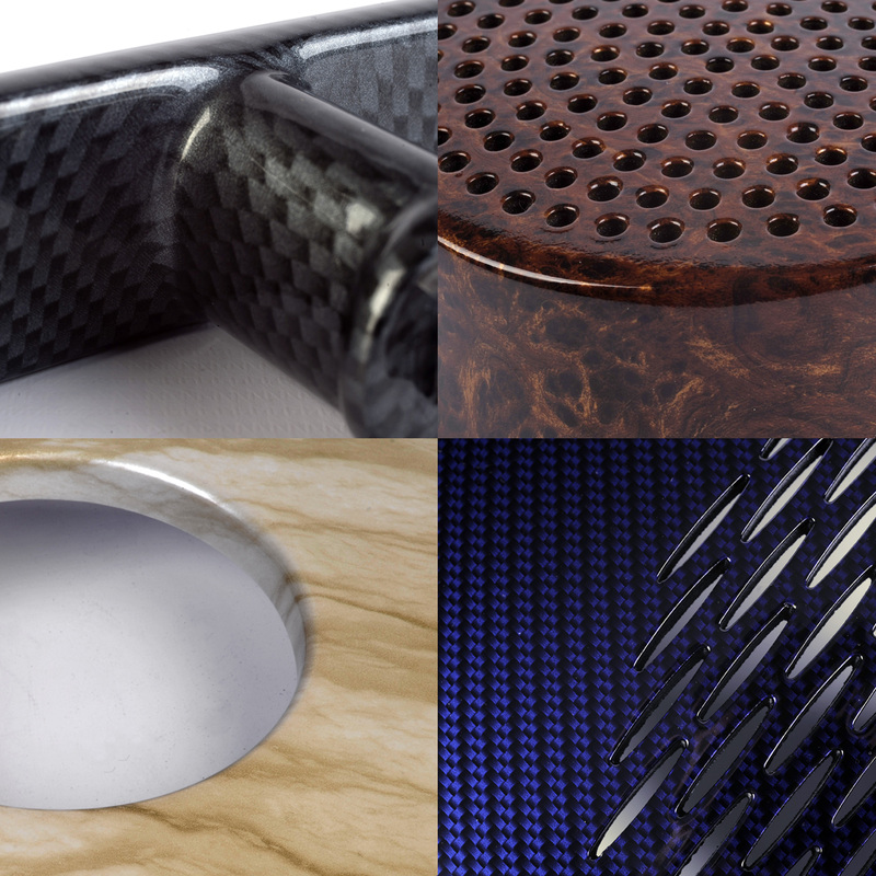 We also offer a range of non-standard finishes for those extra-special applications sometime called for by clients. These include various texture-simulating finishes and wet-transfer 'hydro dipped' high-gloss finishes such as marble, wood or carbon-fibre effects