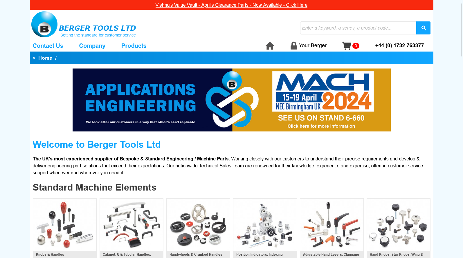 We are a one stop shop for all manufacturing consumables selling; standard machine elements and fixtures, die sets, die springs, nitrogen gas springs, guide pillars and bushes, shoulder bolts, lifting components, dowel pins, drill bushes, mechanical cam units, bending units, transfer units, mould bases and components, wear plates, adjustable handles, tension levers, star knobs, wing nuts, thumb screws, eccentrical cams, toggle clamps, indexing plungers, spring plungers, hinges, latches and locks for doors, cupboards, drawers, hatches and covers, levelling feet, oil level sight glasses and indicators, universal ball and fork joints, tube clamp connectors and mountings, magnets, linear actuators, profiles and much, much more - which you can view on our website www.berger-tools.co.uk