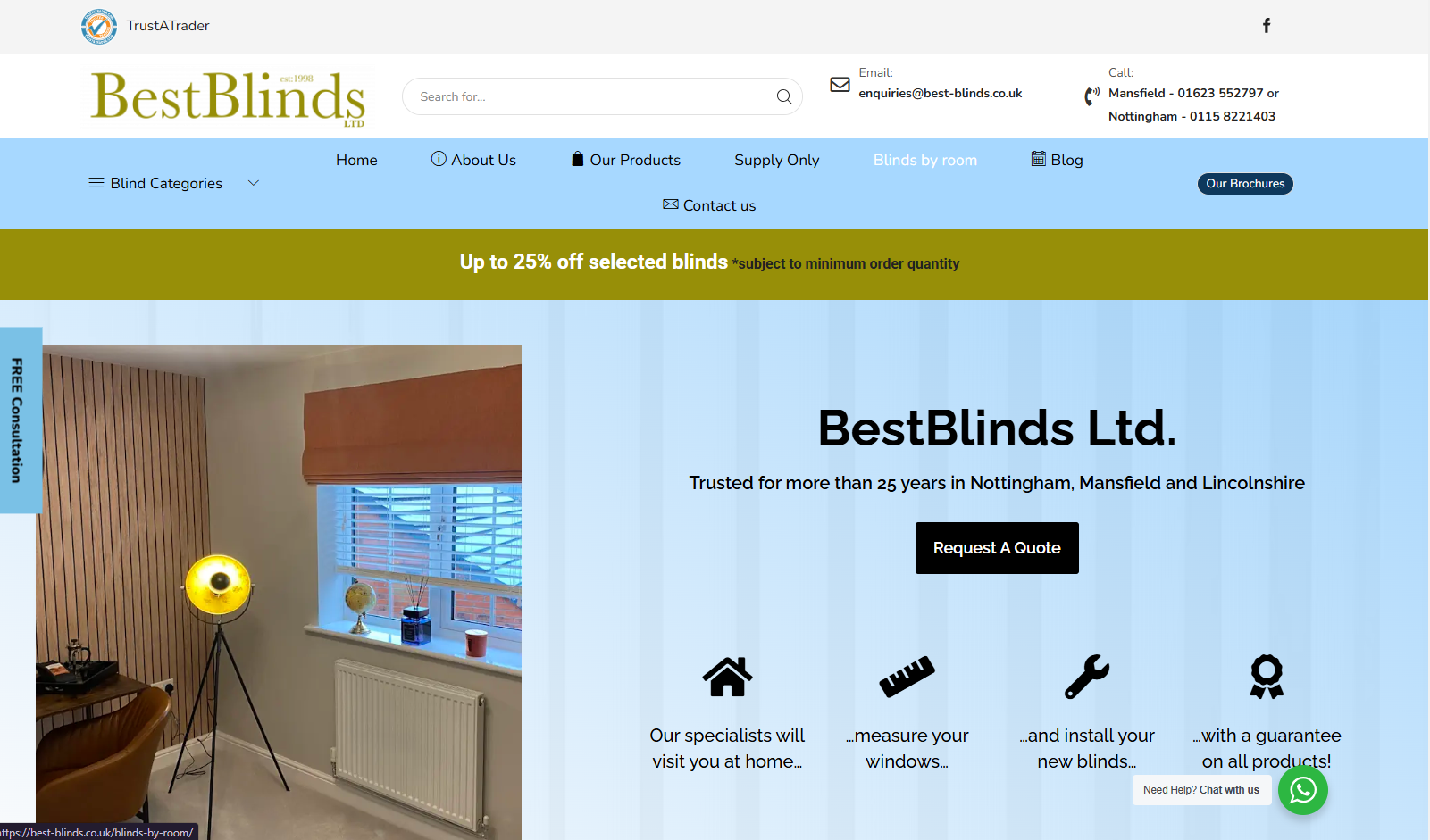 Founded in 1998, BestBlinds has grown from a local, family-run business into a trusted provider of high-quality blinds and services. Our services are available in Mansfield, Nottinghamshire, Derbyshire, and Lincolnshire.