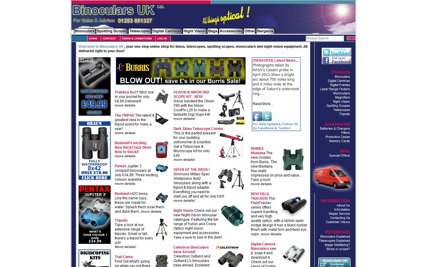 We''re binocular bonkers at Binoculars U.K. Ltd. With us you can find binoculars, spotting scopes, telescopes, digital cameras, night vision, accessories, bags, tripods, lighting and anything else you could need. Our prices and customer services, as well as the quality in our products, is second to none.