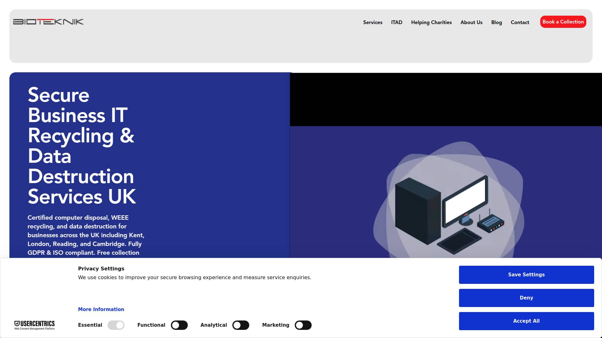 Bioteknik provides secure IT asset disposal (ITAD), certified data destruction and WEEE-compliant IT recycling services for businesses across London, Kent and the South East. We specialise in secure collection, GDPR-compliant data destruction, equipment refurbishment and IT asset recovery. Our services include Certificates of Destruction, full audit trails and responsible recycling for laptops, servers, desktops and networking equipment.