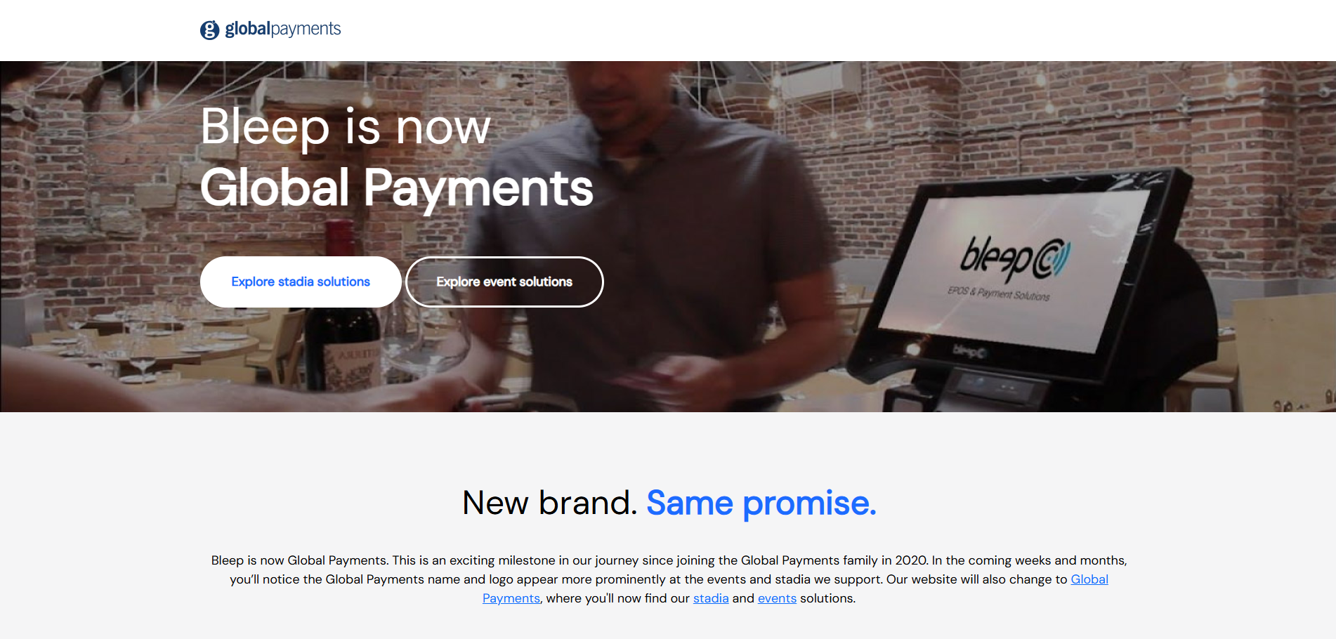 Bleep is now Global Payments. This is an exciting milestone in our journey since joining the Global Payments family in 2020. In the coming weeks and months, you’ll notice the Global Payments name and logo appear more prominently at the events and stadia we support. Our website will also change to Global Payments, where you'll now find our stadia and events solutions.