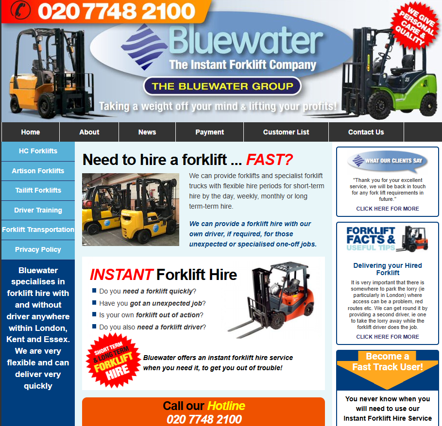 Bluewater Atlantic Ltd trading as Bluewater Equipment Rental has hire fleet stocks covering London and the South East, including Kent, Essex and within the M25. We have many years' experience in recommending the right forklift for your application. With one of the highest credit ratings of any company in our industry, we pride ourselves on our straightforward and honest business dealings.