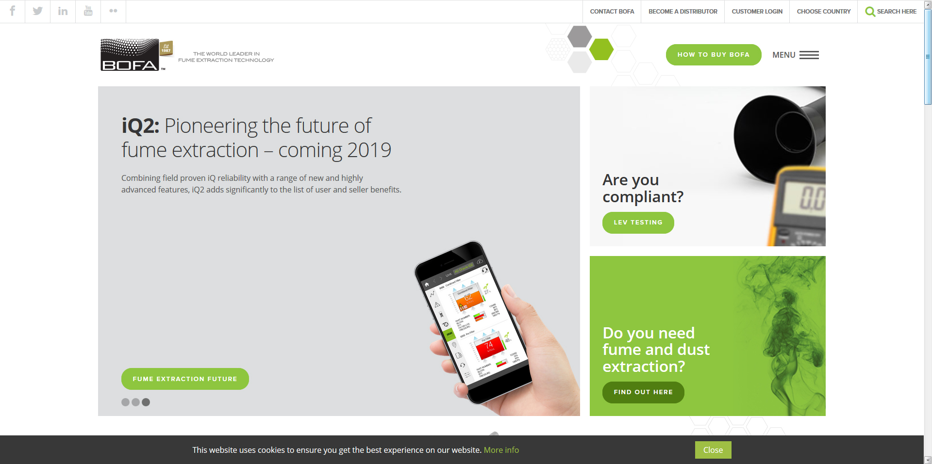 Founded in 1987, BOFA International are a world leading supplier of fume extraction and filtration equipment to the laser and electronics industry. We also work extensively in a wide range of markets including printing and 3D printing, mechanical engineering dental, medical and pharmaceutical, and beauty bringing affordable best in class products to the workplace.