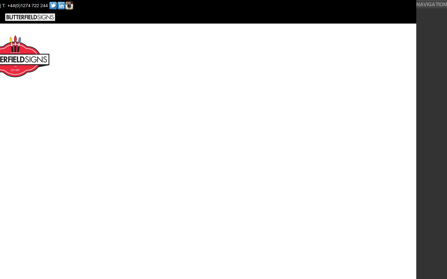 Butterfield Group employs 180 multi-skilled, sign specific experienced personnel operating from the Bradford main factory locations which total 100,000 square feet. In addition to the main factory the group has nationwide supply, installation and maintenance hubs located in London, Bristol, Nottingham and Stirling.