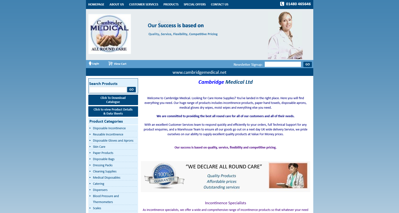 Based in St Ives, Cambridgeshire, Cambridge Medical has been sourcing and supplying a range of healthcare products and domestic consumables to nursing and residential homes, hospitals and the public around the UK since 1993. Our range of medical consumables, have supplied caring professionals with top quality affordable medical products that can be delivered when required.