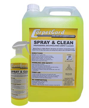 Spray & Clean is a biodegradable, low moisture carpet cleaning chemical, safe to use on all types of carpet and fabric including wool. It contains an integral biocide to control dust mite allergens and other harmful bacteria and an optional deodorising fragrance.