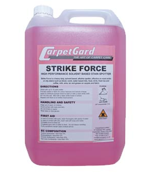 Strike Force is an alkaline spotter, effective on most acidic or oily stains such as blood, vomit, water based inks, food, drink, fresh tea and coffee, milk, wine, tar, and grease on carpets and fabric.