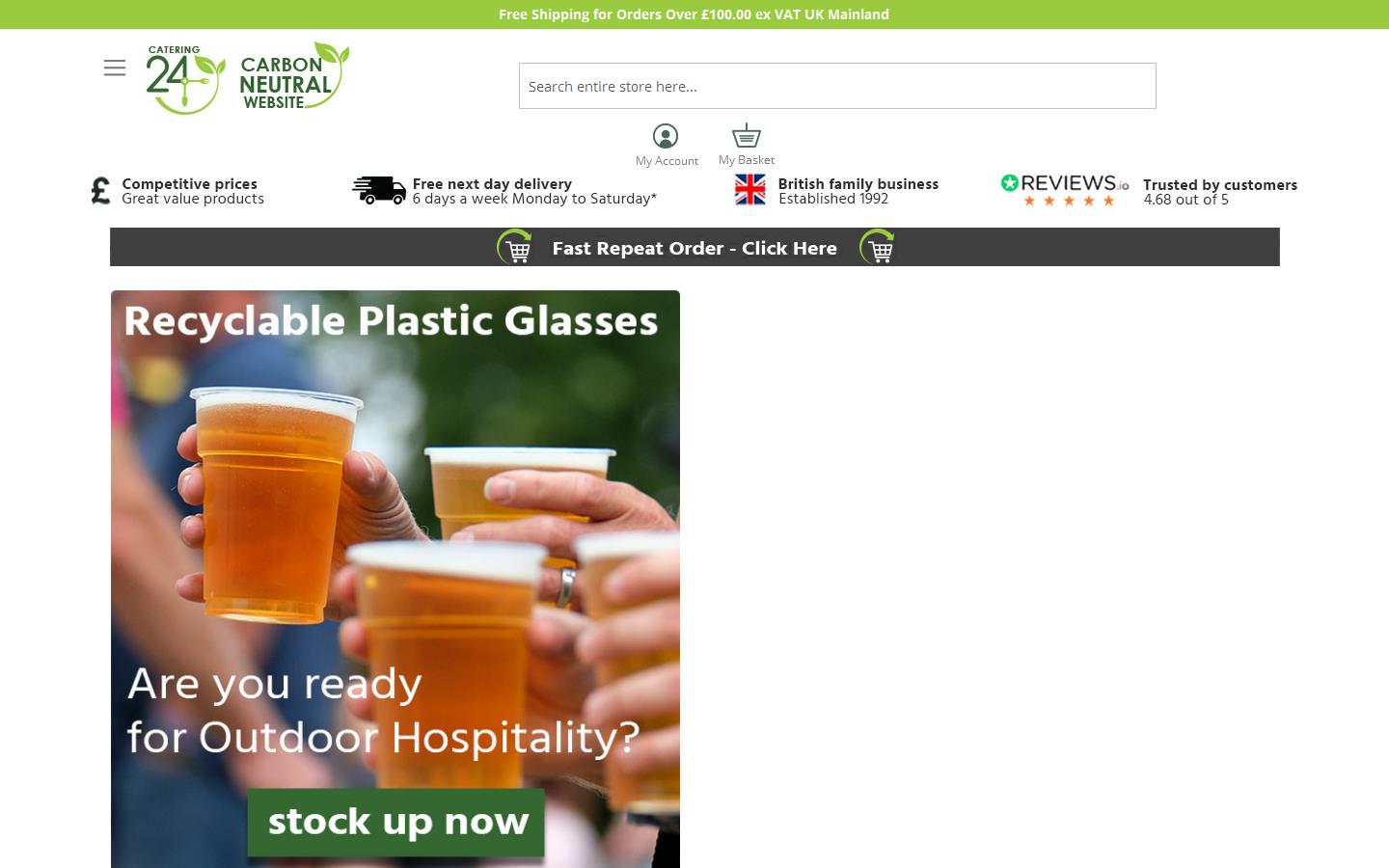 Catering24 supply takeaway food packaging and catering supplies in the UK. We offer free next day delivery 6 days a week Monday to Saturday throughout the UK. We stock a full range of food packaging, paper cups and disposables at the best prices and we have been supplying businesses since 1992. Catering24 are a first and second-generation family business with a high focus on customer service. Specialists in eco-friendly packaging from recyclable through to compostable and biodegradable packaging to suit all businesses needs. Environmental packaging has been a focus of ours for many years and we have been at the forefront of innovation, even committing to the first 100% Recyclable Paper cup to make it commercially available in the UK market. Catering24 also provide a full catalogue of catering supplies and catering equipment with over 30,000 products available from a chopping boards through to panini grills and water boilers. You can order online and if you order before 4pm you will have delivery options for free next day delivery to UK Mainland.