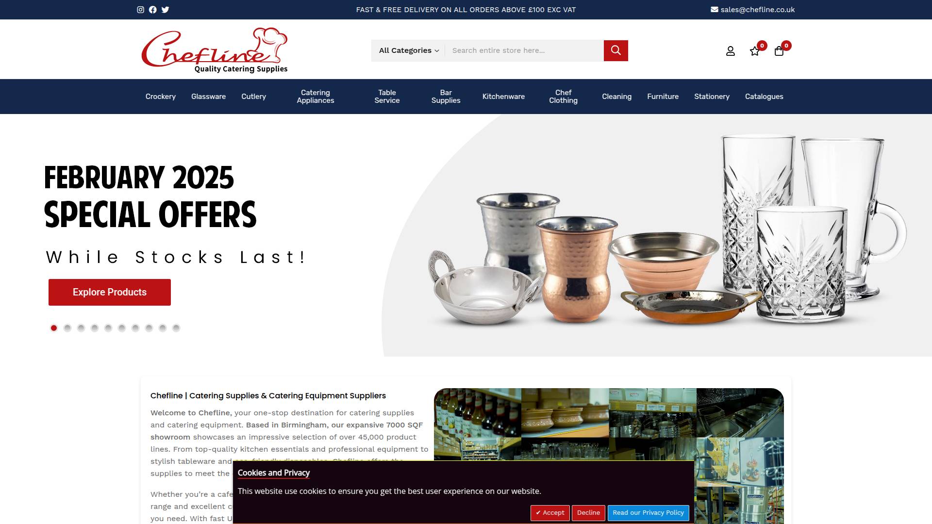 Chefline is a trusted supplier of high-quality catering supplies and equipment serving restaurants, hotels, bars, and catering businesses across the UK. Our extensive range includes crockery, glassware, cutlery, tableware, professional catering appliances, and cleaning solutions ensuring businesses have everything they need for seamless food preparation and service. With competitive pricing, fast and reliable deliveries, and a customer-focused approach we are committed to providing durable, high-performance products that meet the demands of the hospitality industry.