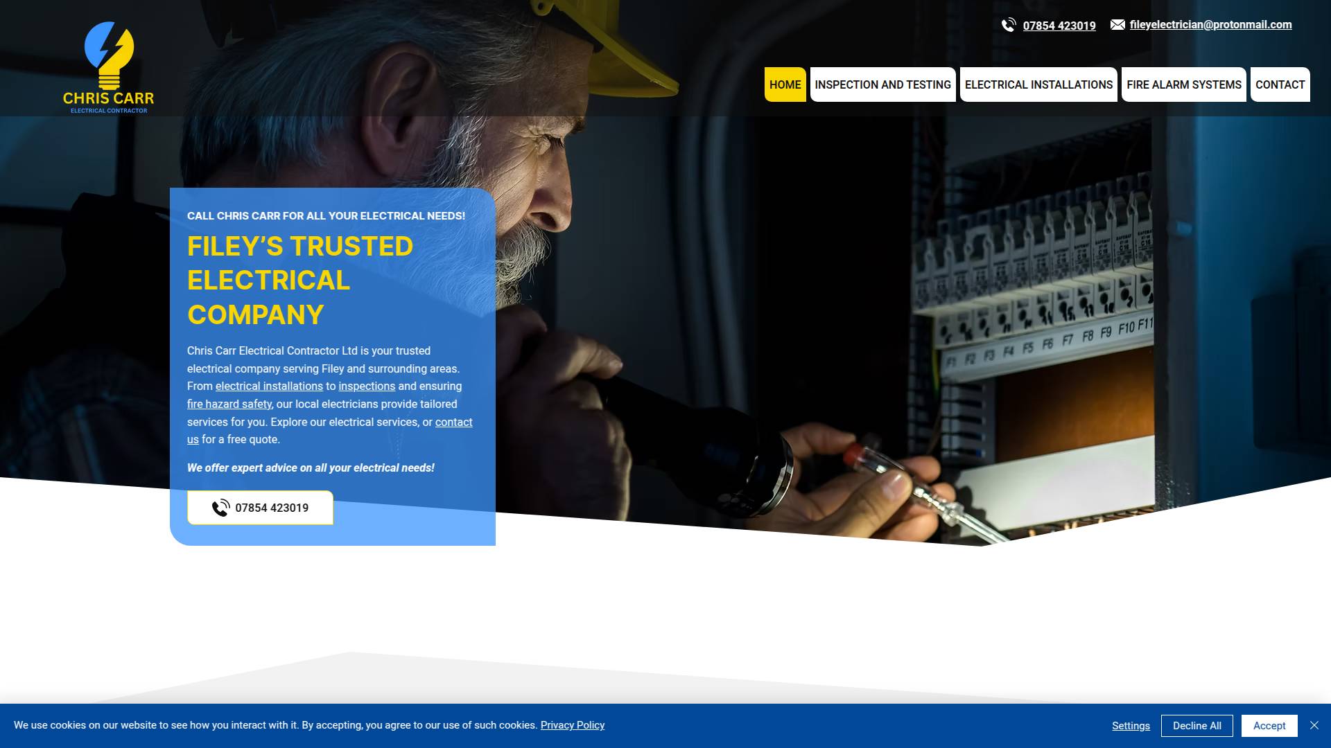 Chris Carr Electrical Contractor Ltd is your trusted electrical company serving Filey and surrounding areas. From electrical installations to inspections and ensuring fire hazard safety, our local electricians provide tailored services for you. Explore our electrical services, or contact us for a free quote.