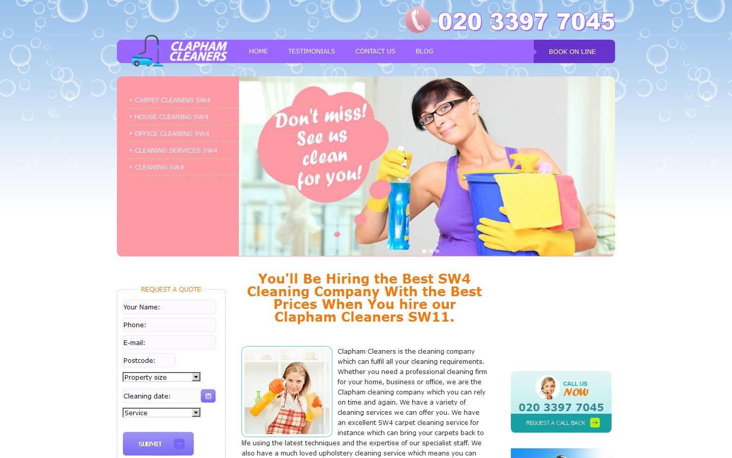 If you''re looking for home cleaners Clapham, then our Clapham Cleaners is just what you''re looking for.By doing that, you no longer have to worry about spending time polishing, scrubbing, wiping - one of our excellent employees can do it all for you. It will immediately seem like a load off your mind.Once you hire a cleaner with us, subject to availability, we can make sure you have the same cleaner over a long period of time. Our cleaners can come to your home on a daily, weekly or monthly or on a one-off basis. To find out how cheap it can be to have your very own home cleaner from our SW4 cleaning firm, then call 020 3397 7938.