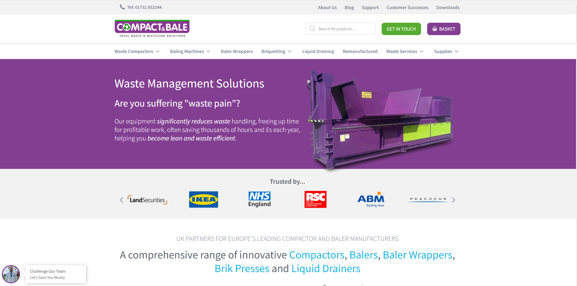 Based in Hadlow, Kent, Compact & Bale have been supplying waste handling equipment to industry for more than 24 years. We are UK partners for some of Europes biggest manufacturers of Compactors, Balers, Baler Wrappers, Briquetting and Liquid Draining machines as well as a range of consumables including Baling Twine & Strapping, Wheelie Bins and Waste Sacks.
