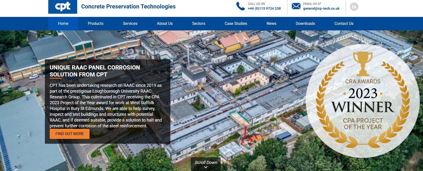 Founded in 2005 CPT has gone from strength to strength, consistently delivering cost effective, innovative and practical solutions. Our Directors have over 80 years of combined experience in concrete repair consultancy and over 60 years of experience in the electro-chemical treatment of reinforced concrete structures. We have produced over 100 technical papers, many of which are available to download from this website, and have frequently collaborated with Loughborough and Nottingham Universities on corrosion related research projects.