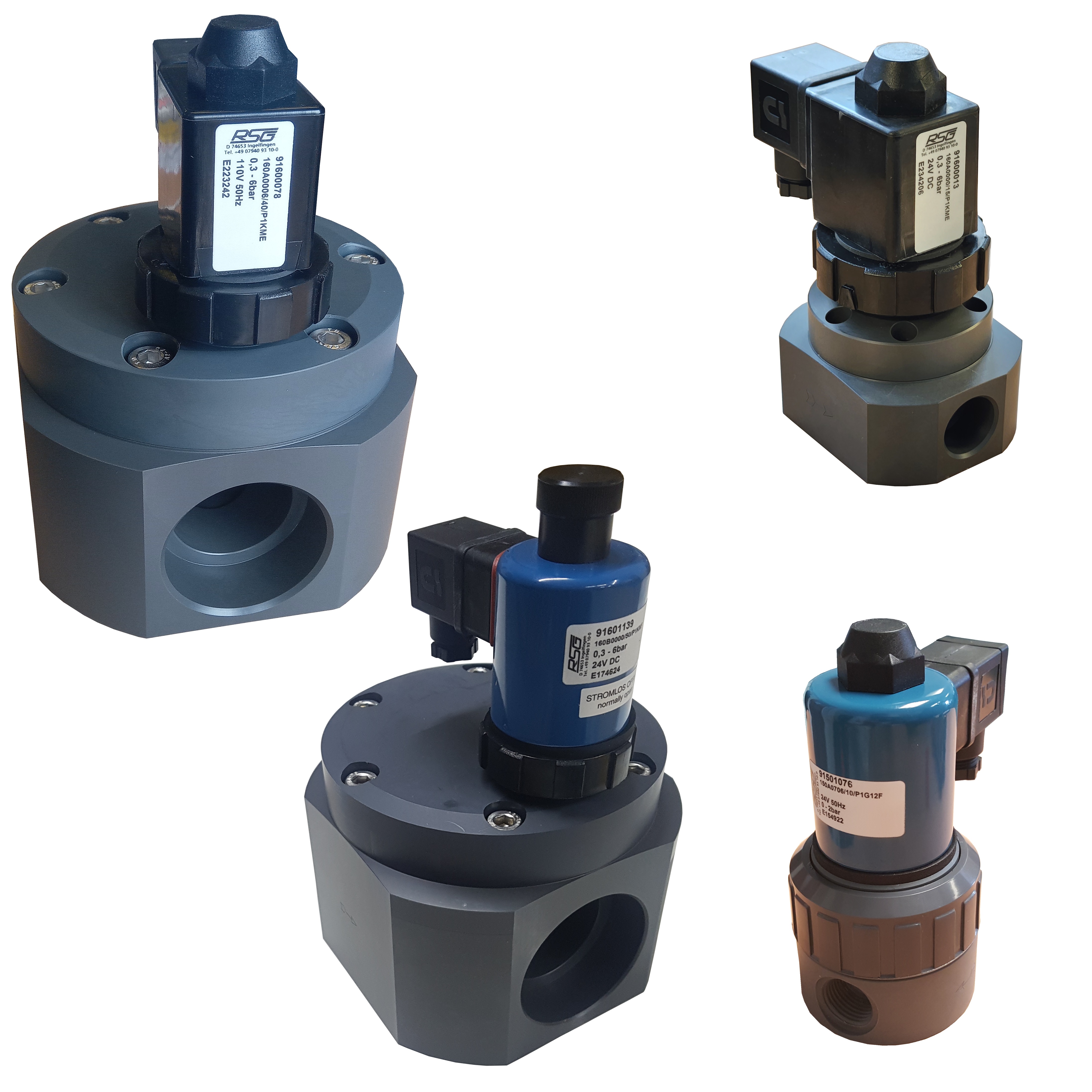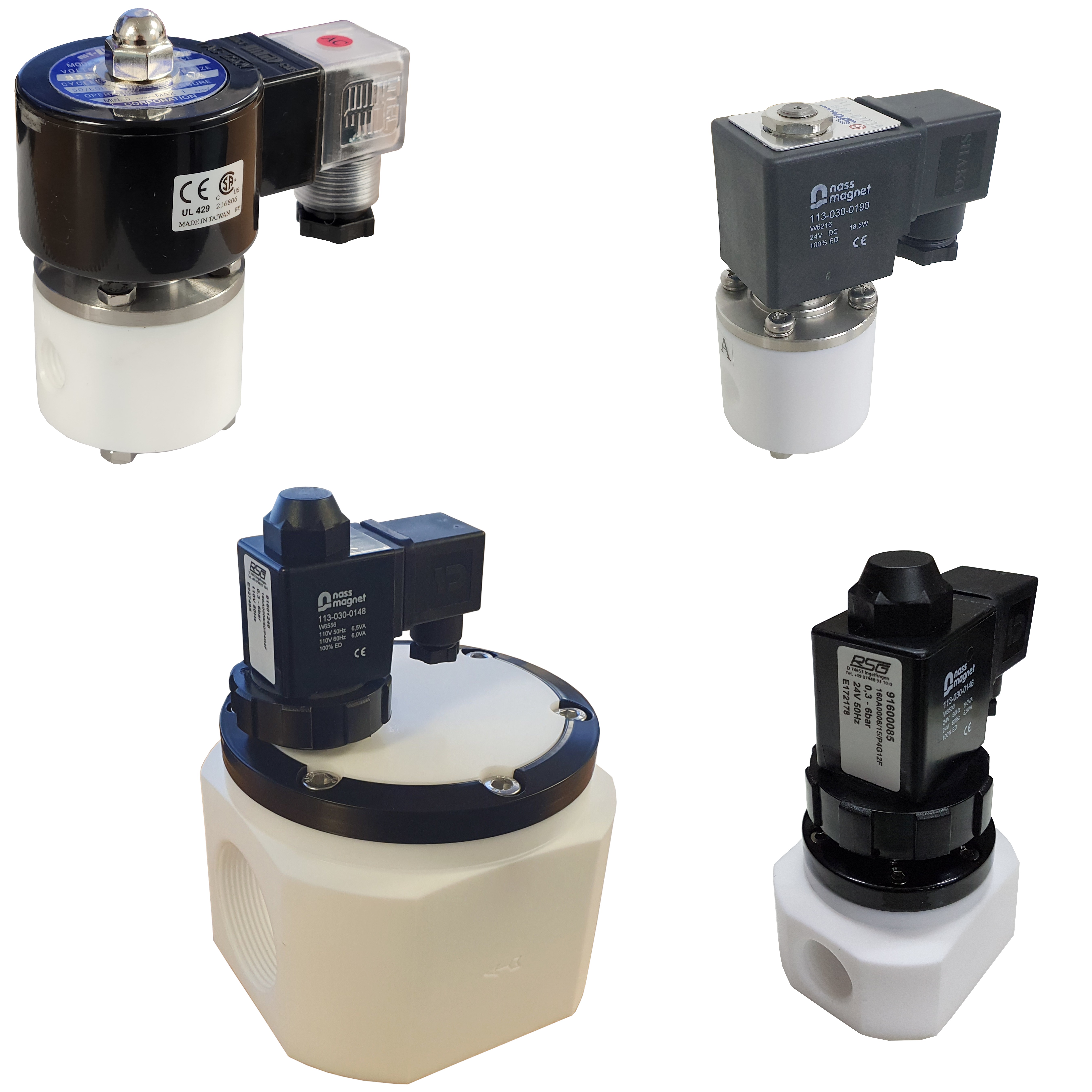 Plastic solenoid valves, Nylon WRAS approved for drinking water or Delrin, PVC, PVDF and PTFE for acid and alkali gases and fluids. Options for normally open, normally closed and latching bi-stable functionality.