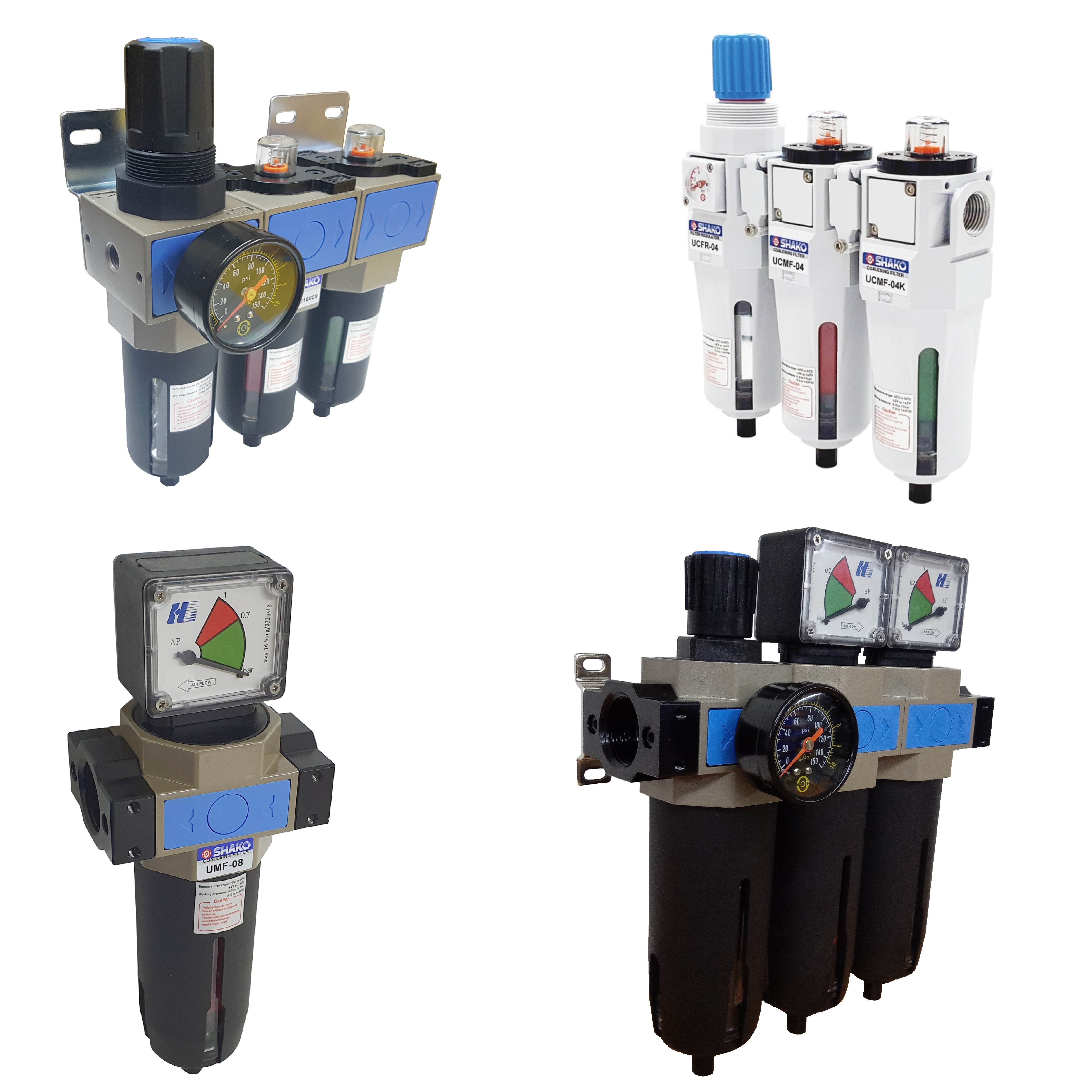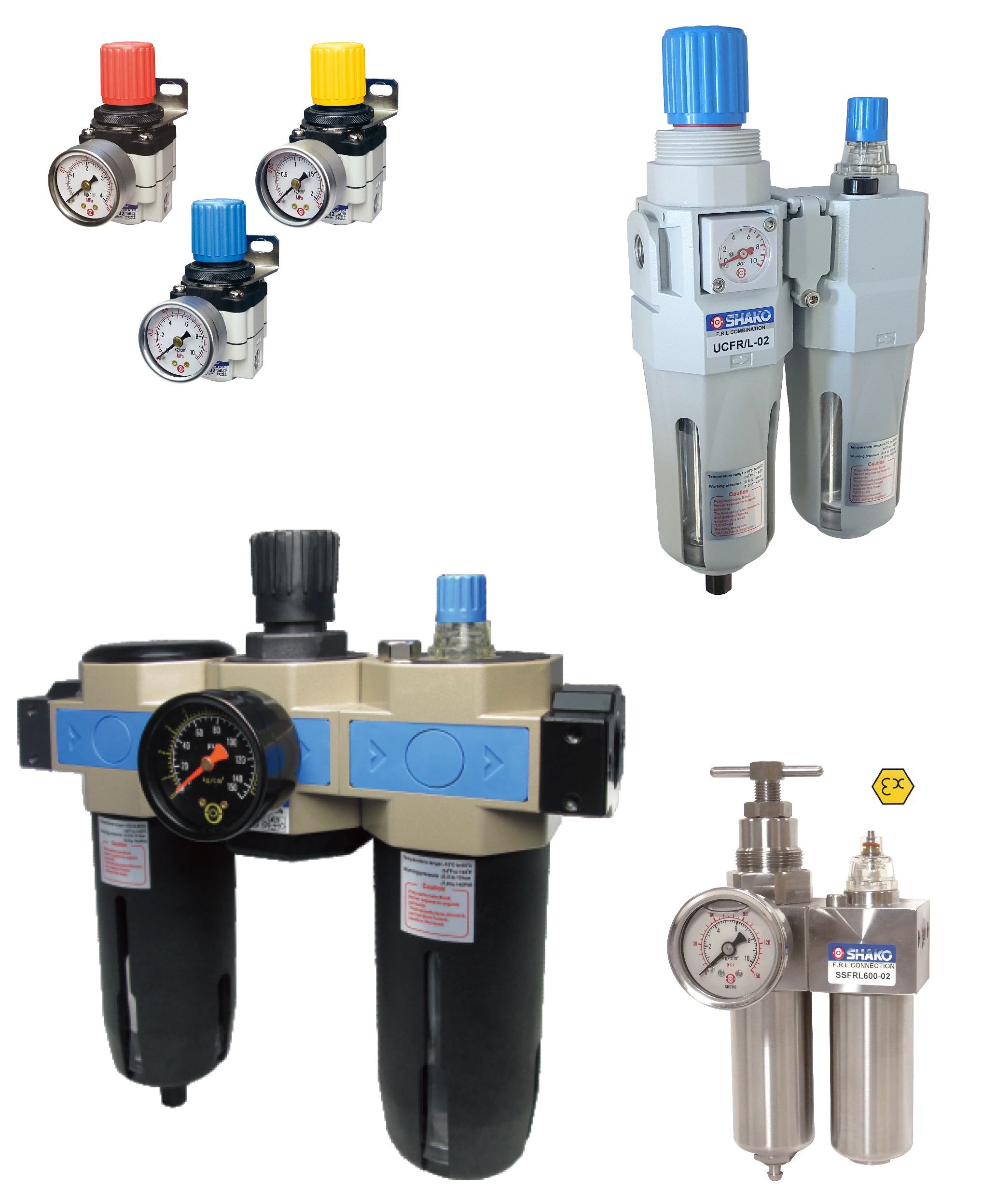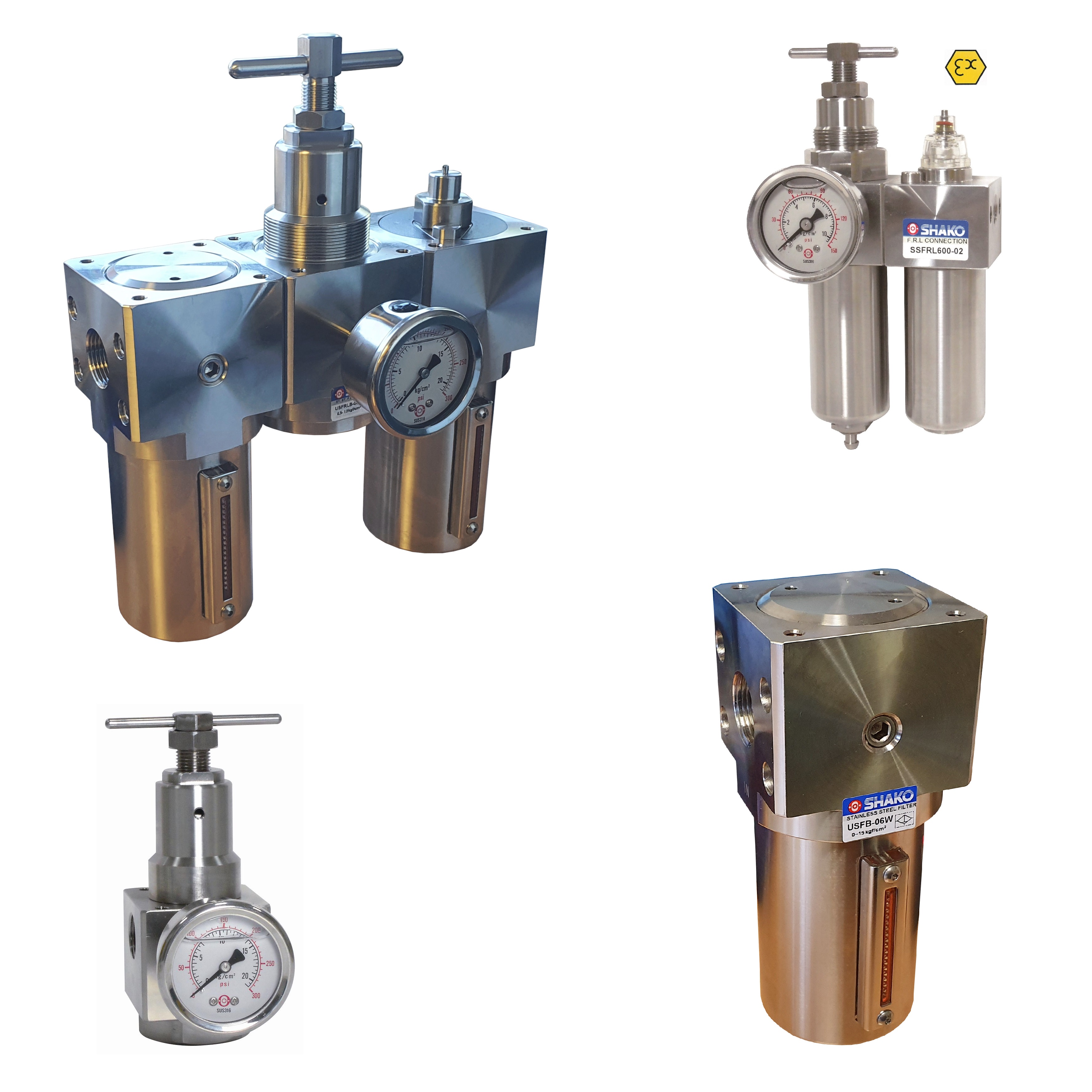 Airline filters, regulators, lubricators and FRL combination sets for air compressor water separation, filtration, pressure control and lubrication for compressed air systems. Offer precise pressure control, rust dust particle water and oil removal. Port sizes 1/8 to 2" thread, standard 0.5-10 Bar and ATEX certified 316 stainless steel 0.5 to 60 Bar.