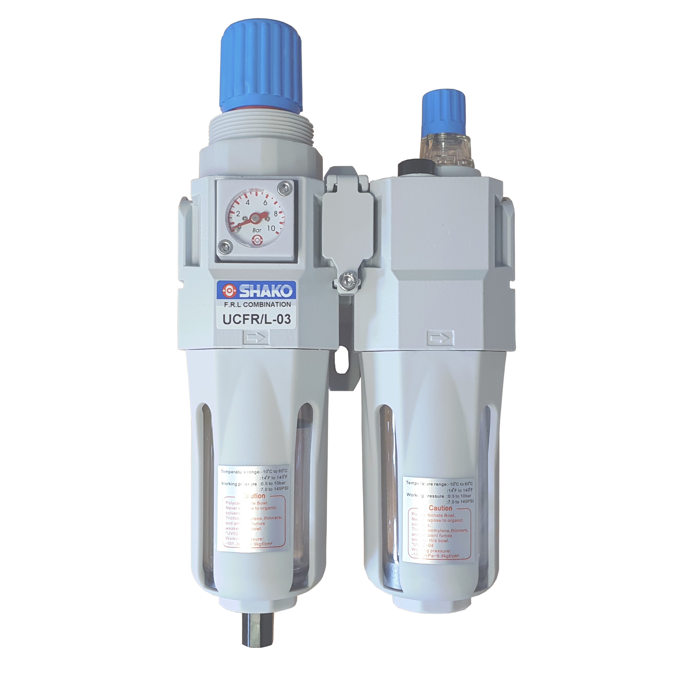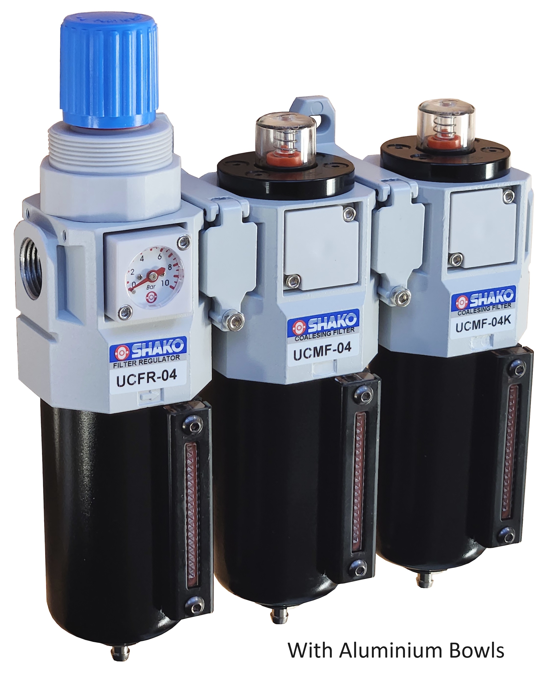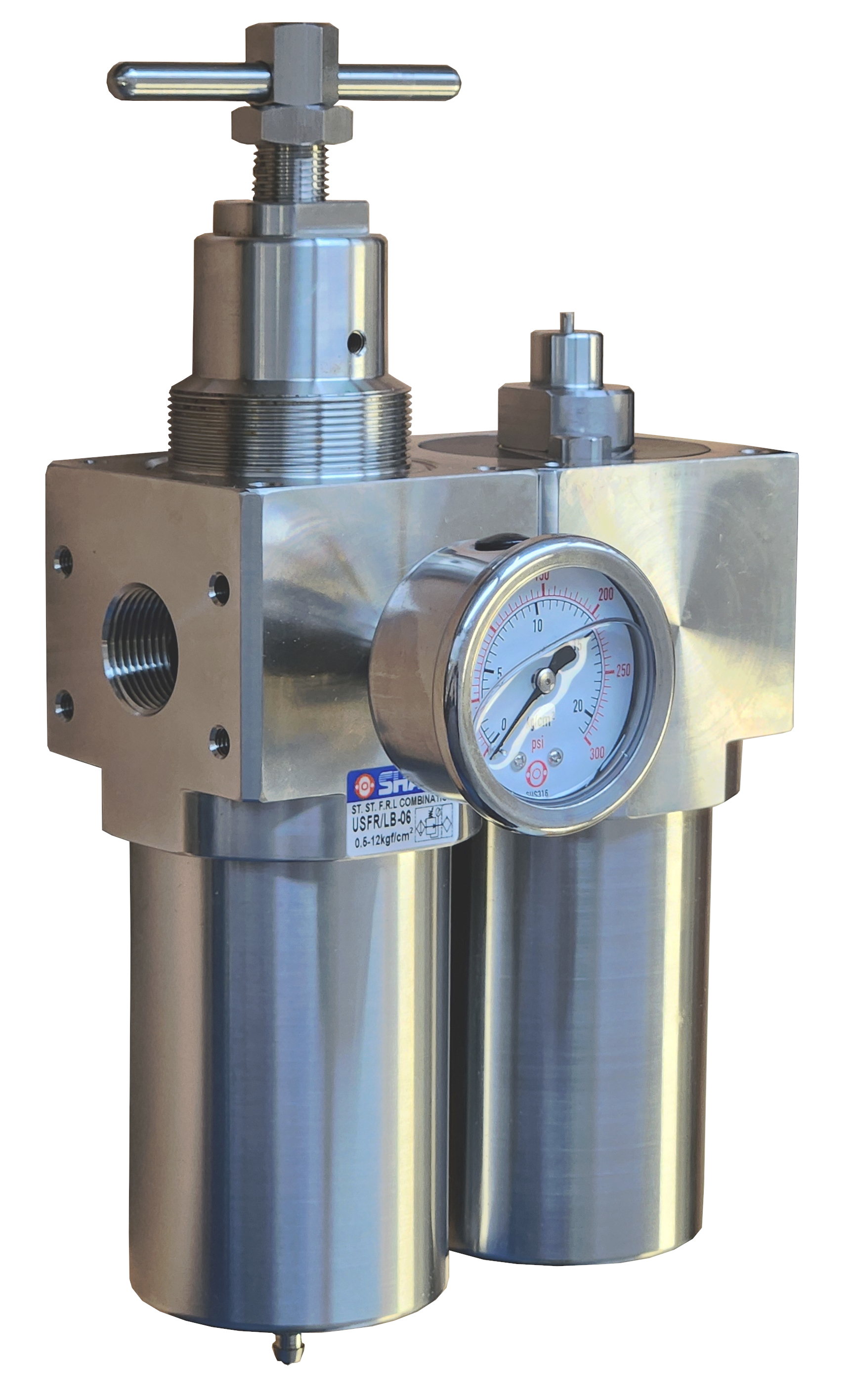 Airline filters, regulators, lubricators and FRL combination sets for air compressor water separation, filtration, pressure control and lubrication for compressed air systems. Offer precise pressure control, rust dust particle water and oil removal. Port sizes 1/8 to 2" thread, standard 0.5-10 Bar and ATEX certified 316 stainless steel 0.5 to 60 Bar.