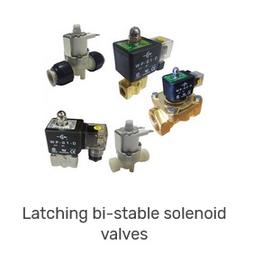 2/2 way Latching / bistable nylon, brass and stainless steel solenoid valves sizes from 1/8 to 2 thread or flange. Require a short 20 millisecond power pulse to stay open, then a reverse polarity (swap +ve and -ve supply) short electrical power pulse to stay closed. Reverse the polarity again and repeat the sequence. Available voltages include 3 volts, 6 volts, 12 volts and 24 volts according to model.
