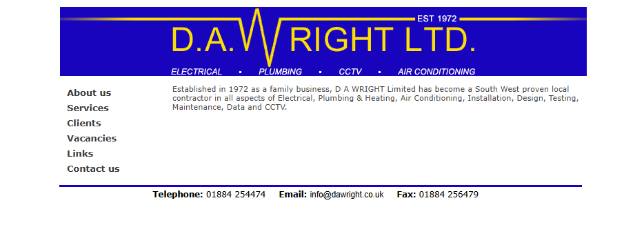 Established in 1972 as a family business, D A WRIGHT Limited has become a South West proven local contractor in all aspects of Electrical, Plumbing & Heating, Air Conditioning, Installation, Design, Testing, Maintenance, Data and CCTV.