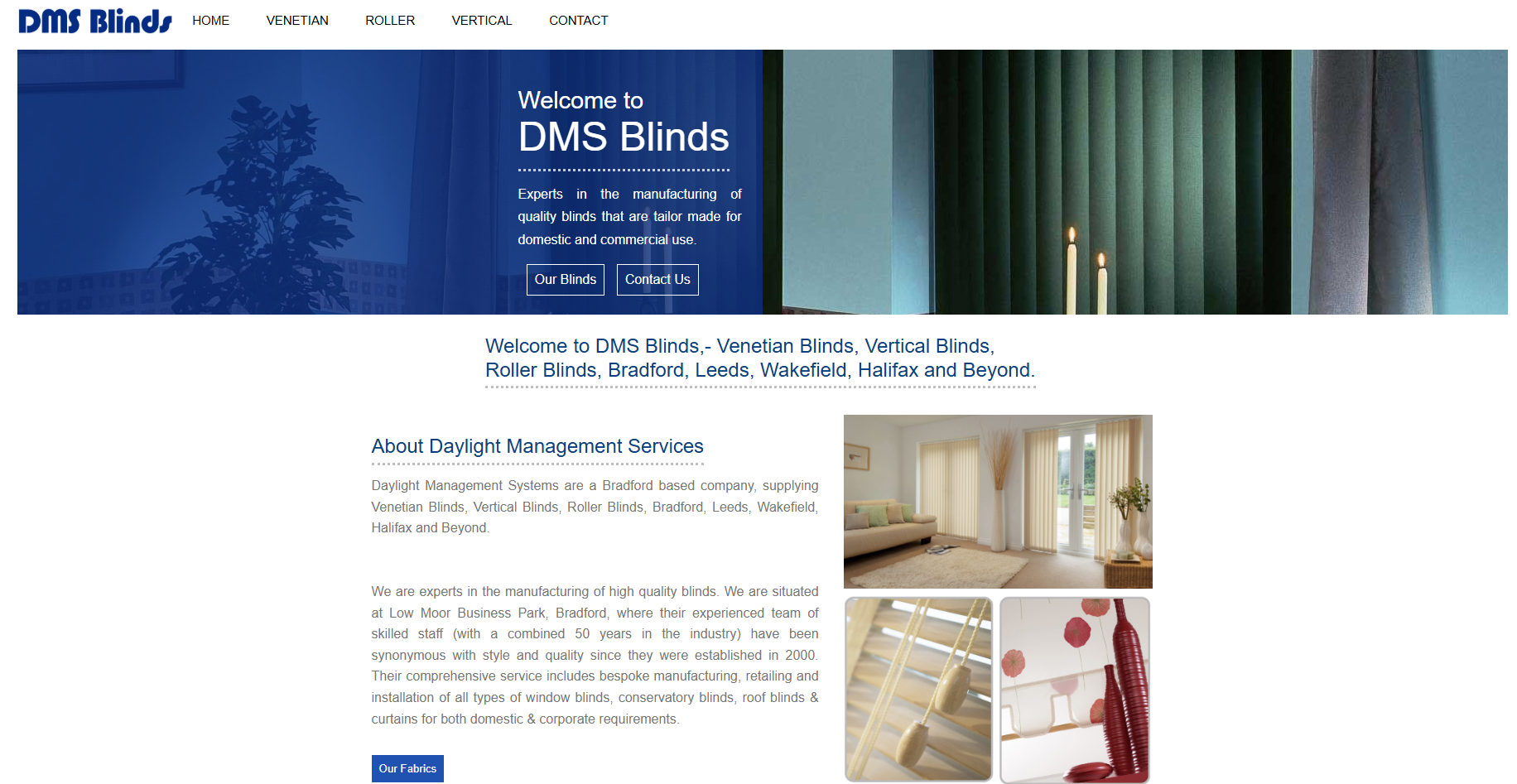 We are experts in the manufacturing of high quality blinds. We are situated at Low Moor Business Park, Bradford, where their experienced team of skilled staff (with a combined 50 years in the industry) have been synonymous with style and quality since they were established in 2000. Their comprehensive service includes bespoke manufacturing, retailing and installation of all types of window blinds, conservatory blinds, roof blinds & curtains for both domestic & corporate requirements.