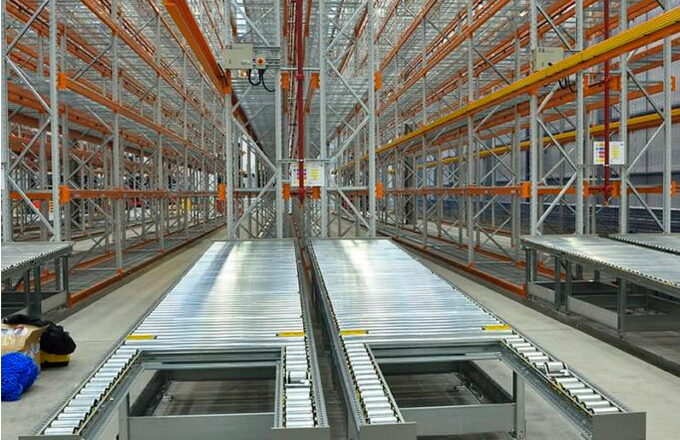 Pallet live racking operates by loading the pallets onto dedicated lanes of inclined, fixed gradient gravity rollers. When one load is removed, the next pallet automatically rolls into position on the picking face. Replenishment stock is loaded from the opposite, higher end of the lane. The pallets’ movement is controlled by speed controllers and brakes fitted within the roller tracks.