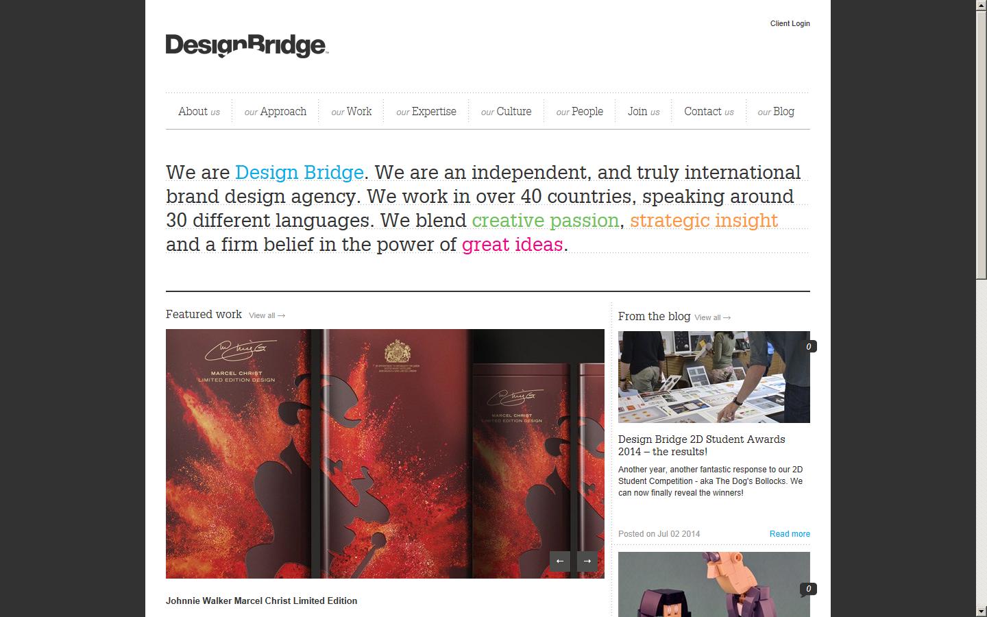 We are Design Bridge. We are an independent, and truly international brand design agency. We work in over 40 countries, speaking around 30 different languages. We blend creative passion, strategic insight and a firm belief in the power of great ideas.